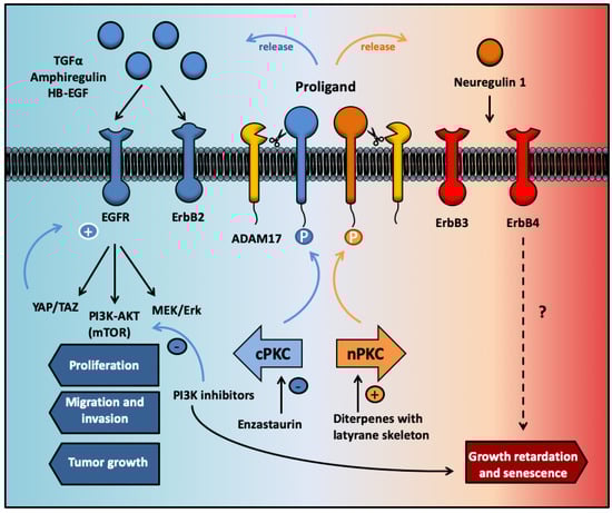 For this purpose, we require drug screenings to reveal novel molecules that specifically activate each isozyme in a reversible manner, without causing the down-regulation or degradation of their ligand. We propose in Figure 4 that the selective activation of different PKC isozymes may lead to the release of different growth factors, which will differentially activate ErbB receptors to modulate different cell functions. Thus, the activation of classical PKC may lead to EGFR ligand release and—as a consequence—to the activation of EGFR-dependent proliferation and the survival of GBM. Conversely, the activation of novel PKC may lead to the release of ADAM17-dependent neuregulins, impairing EGFR ligand release and slowing down GBM proliferation and growth. We hypothesize that the combination of these PKC targeting drugs with current treatments may enhance prognosis and survival time. Diterpenes with the capacity to individually regulate classical and novel PKC have recently been described for use in neuronal regeneration [113,114] and as putative treatments for other cancer types [111]. Thus, these agents could prove useful in the development of drugs either in standalone or in combined strategies with other compounds (e.g., PI3K inhibitors).