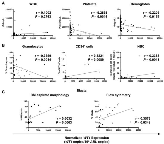 Correlations of normalized WT1 levels with complete blood counts (CBCs), flow cytometry parameters, and percentage of blasts in AML patients. WT1 expression was normalized using ABL as housekeeping gene, and levels were reported as WT1 copies/104 ABL copies. (A) Pearson correlation analysis between normalized WT1 expression and CBCs, such as white blood cells (WBC), platelets, and hemoglobin (Hb) levels. (B) Correlations with percentage of granulocytes, CD34+ cells, and normalized blast count (NBC) by flow cytometry. (C) Correlations with bone marrow (BM) blasts identified by light microscopy (left) or by flow cytometry (right).