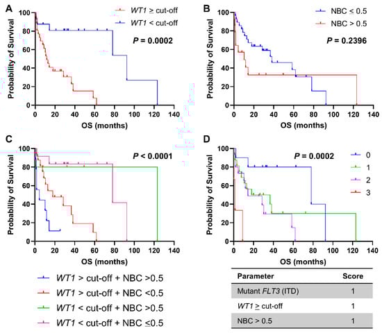 Clinical outcomes of AML patients. Overall survival (OS) of AML patients is reported based on (A) normalized WT1 expression ≥ cut-off (50 copies in peripheral blood or 250 copies in bone marrow samples), (B) normalized blast count (NBC) > 0.5, or (C) combination of these two features. (D) A prognostic score was calculated based on the presence of mutant FLT3, WT1 ≥ cut-off, and NBC > 0.5, and OS were compared among groups. A p < 0.05 was considered statistically significant.