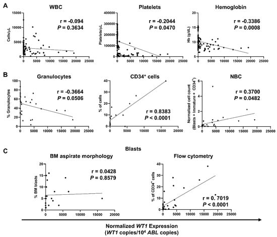 Correlations of normalized WT1 levels with complete blood counts (CBCs), flow cytometry parameters, and percentage of blasts in MDS patients. WT1 expression was normalized using ABL as housekeeping gene, and levels were reported as WT1 copies/104 ABL copies. (A) Pearson correlation analysis between normalized WT1 expression and CBCs, such as white blood cells (WBC), platelets, and hemoglobin (Hb) levels. (B) Correlations with percentage of granulocytes, CD34+ cells, and normalized blast count (NBC) by flow cytometry. (C) Correlations with bone marrow (BM) blasts identified by light microscopy (left) or by flow cytometry (right).