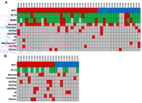 Chromosomal abnormalities in our acute myeloid leukemia (AML) and myelodisplastic syndrome (MDS) patients. (A) AML and (B) MDS patients (UPN) were screened for the presence of cytogenetic abnormalities and divided based on WT1 expression levels at diagnosis (WT1 peripheral blood cut-off, 50 copies; and WT1 bone marrow cut-off, 250 copies). Normal expression WT1 levels are reported in blue, while increased in dark red. For each patient, cytogenetic alteration detected by karyotype or fluorescence in situ hybridization analysis are reported in red. Screening for FLT3 and NPM1 mutations was also performed and reported in green for wild type genes, or in red for mutant forms. Light grey is used when marker was not tested or not present.