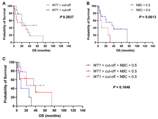Whether to investigate prognostic impact of normalized WT1 levels in MDS, patients were divided in two groups based on WT1 expression at diagnosis (Figure 5A). No statistically significant differences in OS were described between patients with increased WT1 levels at diagnosis and those with WT1 levels < cut-offs (25.9 vs. 20.7 months, WT1 ≥ cut-offs vs. WT1 < cut-offs, respectively; p = 0.0.2837; HR, 1.815; 95% CI, 0.6454 to 5.105). Patients were also divided based on NBC > 0.5 and OS was compared between groups (Figure 5B). A slight shorter OS was documented in patients with NBC > 0.5 at diagnosis compared to those with NBC ≤ 0.5 (9 vs. 35.7 months, NBC > 0.5 vs. NBC ≤ 0.5, respectively; p = 0.0613; HR, 0.3827; 95% CI, 0.0964 to 1.518); however, statistical significance was not reached likely because of the small number of patients in each group (NBC ≤ 0.5, n = 17; NBC > 0.5, n = 5). We then divided patients in four groups based on the combination of WT1 expression levels and NBC at diagnosis, and OS was compared among groups (Figure 5C). Patients with increased WT1 levels and NBC had the shortest OS compared with those with elevated WT1 expression and NBC ≤ 0.5 or those subjects with normal WT1 levels and NBC ≤ 0.5 (9 vs. 36.7 vs. 20.7 months, WT1 ≥ cut-off + NBC > 0.5 vs. WT1 ≥ cut-off + NBC ≤ 0.5 vs. WT1 < cut-off + NBC ≤ 0.5, respectively; p = 0.1648). Statistical significance was not reached likely because of the small number of patients in each group (WT1 ≥ cut-off + NBC > 0.5, n = 5; WT1 ≥ cut-off + NBC ≤ 0.5, n = 8; WT1 < cut-off + NBC ≤ 0.5, n = 9). In multivariate analysis, no statistically significant associations were described.