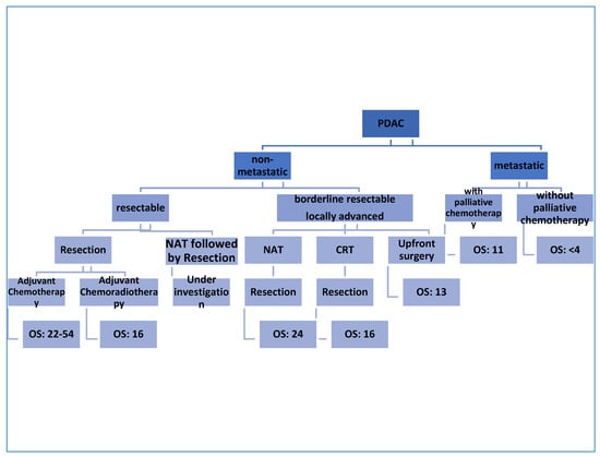 The only curative therapy for PDAC is surgical excision [9]; however, only 10–20% of patients are found to be eligible for resection at the time of diagnosis. More than 50% of patients are found to have metastatic disease at the first presentation [10]. To date, treatment approaches for patients with PDAC depend on the clinical and anatomical stage of the disease [11]. Notably, a great deal of ongoing studies are relying on the molecular pathology of PDAC to identify individualized, tailored plans for PDAC patients [12,13,14]. The initial workup process of PDAC aims to confirm the diagnosis and to look for evidence of distant metastasis [15,16]. Using imaging modalities, non-metastatic PDAC can be classified into resectable, borderline resectable, and locally advanced PDAC based on the involvement of the surrounding arterial (superior mesenteric artery, common hepatic artery, and celiac axis) and venous (superior mesenteric vein or portal vein) structures, and other nearby organs and lymph nodes [17,18]. According to the National Comprehensive Cancer Network (NCCN) guidelines published in 2017, certain criteria should be applied to obtain eligibility for surgical resection; the main goal is to involve as many patients as possible under the umbrella of surgical treatment [19]. The treatment outcome and the median overall survival depends in the first place on the stage of the PDAC, as mentioned in Figure 1.