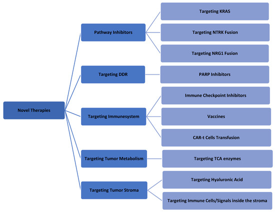A better understanding of the molecular pathology of PDAC could allow researchers to investigate more new modalities for PDAC treatment [66,67,68]. Most of these strategies are still under investigation, and some of them have been aborted because of negative results. As a general rule, the combination of these new modalities (one targeted molecule agent and one cytotoxic agent) leads to better outcomes [69]. Figure 2 summarizes the currently available novel therapies for PDAC.