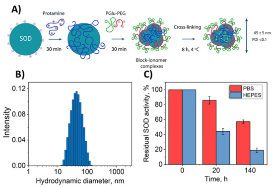 Here, we evaluated a double-coated cross-linked polyion complex partly based on the approach described in Reference [41]. The principal scheme of the synthesis is presented in Figure 1A. Firstly, block–ionomer complexes were formed spontaneously as a result of electrostatic coupling of the enzyme and cationic polymer (protamine) and anionic block copolymer (PolyGlu-PLE). The Block–ionomer complex consists of several SOD1 globules based on the size of the resulting particles (Figure 1B), assuming the size of SOD1 molecule is less than 10 nm. Then, the cross-linker was added to complexes that resulted in covalent stabilization.