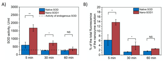 Dynamics of SOD1 and Nano-SOD1 in tears after instillation: (A) SOD1 activity; (B) SOD1 concentration (percentage of labeled SOD1 fluorescence relative to the initial protein fluorescence). The dashed line corresponds to the activity of endogenous SOD in tears. Symbols indicate the significance levels of differences according to the Mann–Whitney U-test: ** p < 0.01; * p < 0.05; NS—no difference.