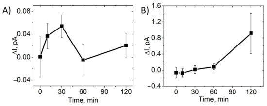 Dynamics of the H2O2 level in rabbit tears and intraocular fluid after a single instillation of Nano-SOD1. The data are presented as mean ± SEM for 5 rabbits. The current is proportional to hydrogen peroxide concentration. The H2O2 dynamics were calculated as the difference between the left (experimental) and right (control) eyes of each animal in tear (A) and intraocular fluid (B).