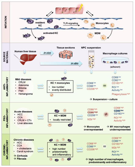 - Tacke, F.; Zimmermann, H.W. Macrophage heterogeneity in liver injury and fibrosis. J. Hepatol. 2014, 60, 1090–1096. [Google Scholar] [CrossRef]
