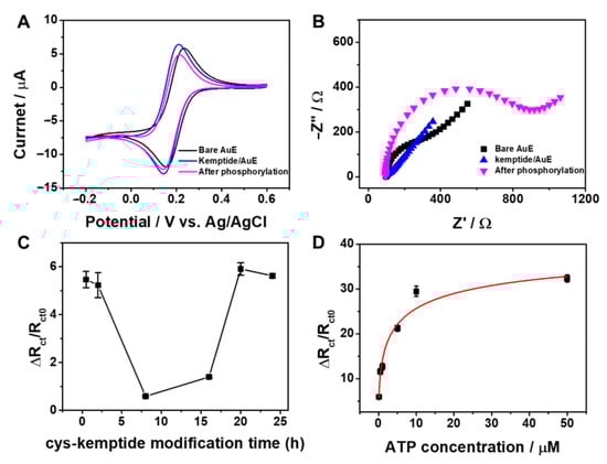 Electrochemical impedance spectroscopy (EIS) measurements also confirm the fabrication and the feasibility of the proposed biosensor. EIS results are presented using Nyquist plots comprising of a semicircle in the high-frequency region and a slope in the low-frequency region, as shown in Figure 1B. Charge transfer resistance, ΔRct estimated from the semicircle diameter is the most sensitive and immediate parameter to reflect the changes of the electrode interface. As shown in Figure 1B, compared to the bare Au electrode, the electrode after self-assembly of cys-kemptide exhibits a smaller semicircle domain with an ΔRct of 22.4 Ω, indicating a very low electron transfer resistance to the redox probe in the electrolyte solution. This is ascribed to the attractive effect of positively charged arginine residues in the kemptide on the redox probe, verifying the immobilization of cys-kemptide on the Au electrodes surface, thus forming the proposed kemptide/AuE biosensor. After the introduction of PKA and ATP into the system, the diameter of the semicircle increased dramatically and the ΔRct was about 709 Ω due to the phosphorylation of serine residue at kemptide/AuE and the subsequent repulsion between (Fe(CN)6)3− and the negatively charged electrode surface. This result verifies the sensing principle of the proposed kemptide/AuE biosensor which can be employed for the label-free electrochemical detection of PKA activity by CV and EIS experiments. However, as shown in Figure 1A,B, the EIS experiments exhibited more sensitive measurements, thus the following measurements have been performed by impedimetric experiments.