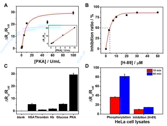 As shown Figure 2B, the inhibition ratio increased correspondingly with increasing concentrations of H-89 and reached the minimum value at about 10 μM. The half-maximal inhibitory value (IC50) was calculated to be about 3.85 μM (Figure 2B, curve a), which is comparable to the previously reported values [11,17]. This result clearly demonstrates that the proposed biosensor can be employed for the screening of protein kinase inhibitors and thus is promising for its potential application in drug discovery and disease therapy. To examine its specificity for the analysis of PKA activity, the proposed biosensor was challenged with potential interferences, such as HSA, thrombin, Hb, and glucose. These biomolecules are possibly present together as a mixture in biological fluids, representing a complex biological matrix. As shown in Figure 2C, the addition of the interferents caused little changes in the impedimetric signal relative to the blank control, while the addition of PKA led to a noticeable ΔRct change response. This proves that the proposed biosensor has high selectivity toward PKA and can be utilized for analysis of complex real samples. Indeed, we could detect PKA activity and inhibition in complex biological samples, such as cell lysates. Figure 2D shows PKA activity and inhibition assay of the sensor in HeLa cell lysates. As shown in the left bars of Figure 2D, the electrochemical response increased with the incubation time, which may reflect a time-dependent rise in PKA activity. In contrast, when H-89 was introduced into the cell lysate, the sensor responses were suppressed, indicating H-89 inhibited the enzymatic activity of PKA (Figure 2D right bars).
