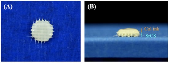 (A) Top and (B) side view photo images of the Col bio-ink/SrCS bi-layer scaffolds.