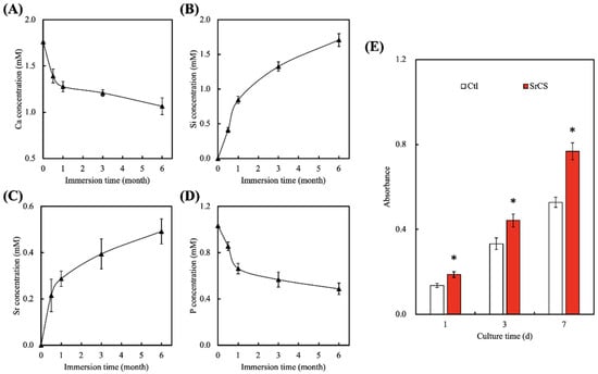 An important aspect of a good scaffold is its ability to have sustained and controlled the release of ions into its surrounding. The ions released from the scaffolds were known to influence certain behaviors of cells and the profiles of several released ions were as shown in Figure 4. As can be seen, there was a sharp decline in the concentrations of Ca and P ions for the first 24 h of immersion, followed by a sustained decline up to 6 months of immersion [35]. On the other hand, there was a burst release in Si ions of about 0.5 mM and Sr ions of about 0.2 mM for the first 24 h of immersion, followed by a gradual release of ions up until 6 months of immersion. As reported by others, <2 mM of Si ions in the surrounding fluid was known to stimulate collagen production and enhance cellular proliferation [36]. It could be seen that after 6 months of immersion, the total accumulated amount of Si ions in the DMEM was 1.6 mM. In addition, Sr ions were reported to enhance osteogenic capabilities of cells via increasing secretion of ALP and OC [37]. Furthermore, an adequate presence of Sr ions was known to reduce and regulate inflammatory responses. Therefore, it is important that the scaffold is able to release various ions in a sustained manner; yet, at the same time, it must be controlled to avoid detrimental and toxic effects. Gao et al. reported that the release of alkaline ions into the environment enhances tissue–scaffold interaction due to the presence of amide bonds [38]. In addition, SrCS was able to significantly enhance the proliferation of WJMSCs as compared to the control (Ctl), which had approximately 1.3-, 1.3-, and 1.5-times the level of proliferation as compared to Ctl after 1, 3 and, 7 days of culture, respectively (Figure 4E). Kendler indicated the cell cultured medium with different ions regulated the osteoblast-like cells in increased extracellular matrix protein synthesis and promoted the proliferation and differentiation behavior of osteoblasts [39].