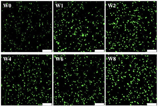The cytotoxicity test and cellular proliferation capability is an important factor to consider when choosing the bio-ink. Live/dead assay was conducted at weeks 0, 1, 2, 4, 6, and 8 and the results were shown in Figure 5. As can be seen, there were no dead cells (red fluorescence) at all time points, thus indicating that this Col-based bio-ink was non-toxic to hGF. Furthermore, hGF quantities doubled after 1 and 2 weeks of culture and increased steadily over the rest of the culture duration. In addition, the cells were homogeneously encapsulated in Col-based bio-ink, which is important to allow efficient regeneration. The success of Col-based bio-ink depends on the composition and microstructure of the hydrogel. Thus, it would be ideal if we are able to mimic the native structure of the tissue. Collagen is the main component in most soft tissues, including periodontal ligament and gingiva [40]. In addition, collagen forms part of the extracellular matrix and thus the interactions between collagen and cells are vital in regulating cellular behaviors. Collagen has been examined as the ideal matrix to develop bi-layer scaffolds due to its outstanding biocompatibility and capacity to improve cell proliferation and differentiation, inducing several signal pathways to prove specific tissue-related protein expression [41]. Furthermore, as a natural molecule, collagen is biodegradable, biocompatible, easily available, and highly versatile, therefore making it an excellent polymer for tissue engineering [42].