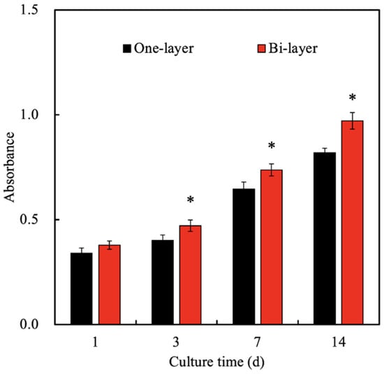 The proliferation of encapsulated hGF cultured under one-layer or bi-layer scaffolds for various time-points. * indicates significant difference (p < 0.05) from the one-layer group.