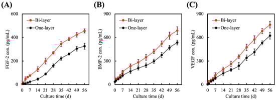 Evaluation of (A) FGF-2, (B) BMP-2, and (C) VEGF secreted from hGF encapsulated in one-layer or bi-layer scaffolds for different time-points.