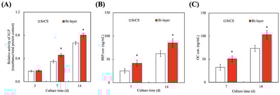 (A) The ALP, (B) BSP, and (C) OC proteins expression of WJMSCs cultured on SrCS and bi-layer scaffolds for different time-points. Data presented as mean ± SEM, n = 6 for each group. * indicates a significant difference (p < 0.05) when compared to SrCS.