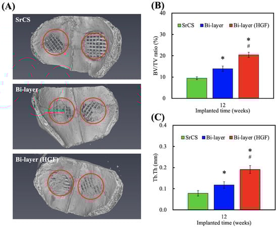 (A) Representative µCT images of osteoporotic rabbits’ cranial bone defect model with different 3D-printed scaffolds after implanted for 12-weeks. The µCT-quantified histograms of (B) bone volume/total volume (BV/TV) and (C) trabecular thickness (Tb.Th). * indicates a significant difference (p < 0.05) when compared to SrCS. # indicates a significant difference (p < 0.05) when compared to bi-layer.