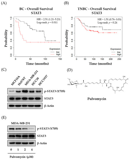 To confirm the involvement STAT3 in TNBC, the clinical significance of STAT3 expression in patients with BC and TNBC was analyzed for overall survival (OS) using the Kaplan−Meier method. The auto-select best cutoff method was used to classify patients with breast cancer. As shown in Figure 1A,B, high levels of STAT3 expression were associated with a decreased probability for OS compared with low levels of STAT3 expression in both patients with BC and TNBC. These data indicate that in patients with TNBC, OS is inversely correlated with levels of STAT3 expression; thus, STAT3 might be a therapeutic target for TNBCs. Since STAT3 signaling is highly associated with TNBC cell proliferation [14], basal expression levels of activated-STAT3 (p-STAT3 [Y705]) were analyzed in a panel of TNBC cell lines (Figure 1C). All tested TNBC cell lines (Hs578T, MDA-MB-231, HCC38, and HCC1937) exhibited markedly higher p-STAT (Y705) expression when compared to the normal breast epithelial cell line (MCF10A). In particular, MDA-MB-231 cells exhibited the highest expression level of p-STAT3 (Y705); hence, the MDA-MB-231 cell line was selected as a representative cell line for TNBC in subsequent experiments for evaluating the effect of pulvomycin (Figure 1D). First, we assessed the effect of pulvomycin on the proliferation of TNBC cell lines. Pulvomycin exhibited potent antiproliferative activity against all tested TNBC cell lines (Table 1). In addition, the antiproliferative activity of pulvomycin against MCF10A was up to 20-fold lower than that against TNBC cells, which indicates that pulvomycin exhibits a relatively selective antiproliferative activity against TNBC cells compared with normal breast cells. STAT3 signaling is activated by the direct phosphorylation of a specific tyrosine residue (Y705) [32]. To confirm whether the antiproliferative activity of pulvomycin in TNBC cells is associated with STAT3 signaling, levels of p-STAT3 (Y705) expression in pulvomycin-treated MDA-MB-231 cells were evaluated through Western blot analysis. As shown in Figure 1E, the levels of p-STAT3 (Y705) were downregulated by pulvomycin in a concentration-dependent manner.