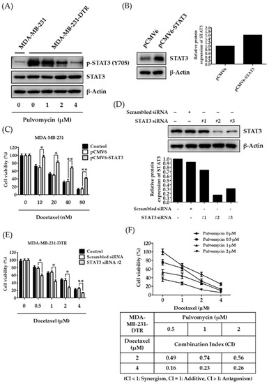 Clinical evidence suggests that acquired resistance to previously treated chemotherapeutics is the major cause of treatment failure [33,34]. Although docetaxel elicits favorable initial responses against patients with TNBC, acquired resistance to docetaxel occurs after one year of treatment [35]. To further elucidate mechanisms of docetaxel resistance in TNBC cells, docetaxel-resistant MDA-MB-231 cells (MDA-MB-231-DTR) were established through continuous exposure of drug-sensitive MDA-MB-231 cells to docetaxel. MDA-MB-231-DTR cells exhibited approximately 90-fold resistance to docetaxel compared to parental MDA-MB-231 cells (Table 2). However, pulvomycin exerted potent antiproliferative activity with similar IC50 values in both cell lines. These data suggest that pulvomycin can overcome docetaxel resistance in MDA-MB-231-DTR cells. STAT3 signaling was reported to mediate drug resistance in various types of cancers [16,17,18]. Therefore, we evaluated levels of p-STAT3 (Y705) expression to confirm whether STAT3 signaling is involved in docetaxel resistance. MDA-MB-231-DTR cells exhibited p-STAT3 (Y705) overexpression compared to their parent cells; p-STAT3 (Y705) overexpression was effectively reverted by treatment with pulvomycin for 24 h (Figure 2A). To validate whether acquired resistance to docetaxel in human TNBCs is associated with STAT3 expression, docetaxel sensitive MDA-MB-231 cells were transfected with the STAT3 plasmid. The cytotoxic effect of docetaxel decreased in STAT3-induced cells compared to control vector-transfected cells (Figure 2B,C). By contrast, STAT3 knockdown in docetaxel-resistant MDA-MB-231 cells with STAT3 siRNA recovered their sensitivity against docetaxel (Figure 2D,E). These data support the hypothesis that STAT3 plays a critical role in the docetaxel resistance of TNBC cells. We further evaluated whether pulvomycin could resensitize resistant cells to docetaxel. Treatment with docetaxel and pulvomycin exhibited higher antiproliferative activity compared to treatment with either drug alone, and the synergistic effects were calculated through CI analysis using the Chou–Talalay method [27] (Figure 2F).