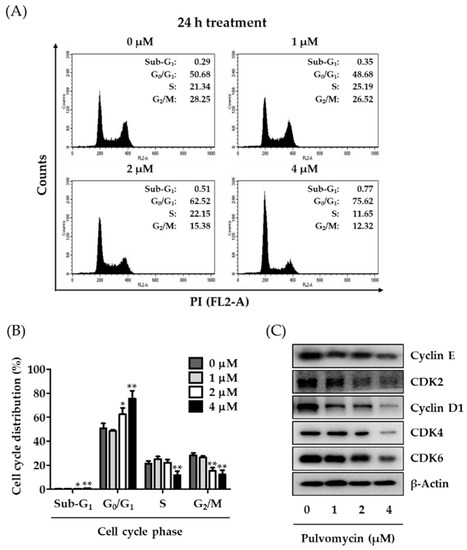 Effects of pulvomycin on cell cycle regulation. (A,B) MDA-MB-231-DTR cells were treated with the indicated concentrations of pulvomycin for 24 h and fixed with 70% ethanol for 24 h. Cell cycle distribution was determined in cells incubated with RNase A and PI for 30 min using flow cytometry. Data are presented as the mean ± SD (n = 3). * p < 0.05 and ** p < 0.01 compared with the control. (C) MDA-MB-231-DTR cells were treated with the indicated concentrations of pulvomycin for 24 h, and levels of cyclin E, CDK2, cyclin D1, CDK4, and CDK6 expression were determined using Western blot analysis. β-Actin was used as an internal control.