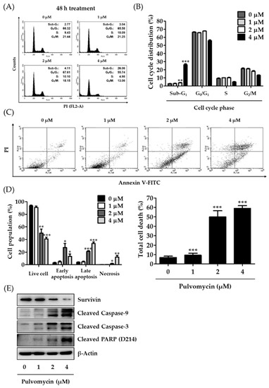 Effects of pulvomycin on apoptotic cell death. (A,B) MDA-MB-231-DTR cells were treated with the indicated concentrations of pulvomycin for 48 h and fixed with 70% ethanol for 24 h. After incubation with RNase A and PI for 30 min, cell cycle distribution was determined using flow cytometry. Data are presented as the mean ± SD (n = 3). ** p < 0.01 and *** p < 0.001 compared with the control. (C,D) MDA-MB-231-DTR cells were treated with the indicated concentrations of pulvomycin for 48 h and stained with Annexin V-fluorescein isothiocyanate (V-FITC) and PI. Annexin V/PI-positive cells were analyzed using flow cytometry to evaluate the apoptotic cell population. Data are presented as the mean ± SD (n = 3). * p < 0.05, ** p < 0.01, and *** p < 0.001 compared with the control. (E) MDA-MB-231-DTR cells were treated with the indicated concentrations of pulvomycin for 48 h, and levels of survivin, cleaved caspase-9, cleaved caspase-3, and cleaved poly (ADP-ribose) polymerase (PARP) (D214) expression were determined using Western blot analysis. β-Actin was used as an internal control.