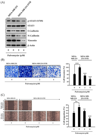 Metastasis is responsible for almost 90% of cancer-related deaths, and BC is one of the most metastatic cancers, with metastasis rates reaching approximately 40% [43]. Moreover, metastatic potential increases when cancer cells acquire resistance [44]. Because STAT3 target genes are involved in critical steps of metastasis [45], the metastatic potential of MDA-MB-231-DTR cells was evaluated by analyzing epithelial-mesenchymal transition (EMT) biomarkers. In docetaxel-resistant MDA-MB-231 cells, E-cadherin (an epithelial marker for cell junctions) was downregulated, whereas N-cadherin (a mesenchymal marker) was upregulated. These aberrantly regulated EMT biomarkers were considerably downregulated by pulvomycin (Figure 5A). To further investigate the effects of pulvomycin on cancer cell metastasis, Transwell invasion and migration (wound healing) assays were performed. Consistently, MDA-MB-231-DTR cells exhibited increased invasion and migration, which were inhibited by treatment with pulvomycin for 24 h (Figure 5B,C). Taken together, these data indicate that pulvomycin exhibits anti-invasive and antimigration activities by regulating EMT biomarkers in docetaxel-resistant TNBC cells.