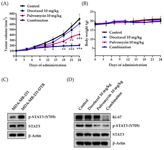 To further confirm the synergistic effect of pulvomycin and docetaxel on the growth of resistant tumors, antitumor activity was evaluated using a xenograft mouse model implanted with MDA-MB-231 or MDA-MB-231-DTR cells. When the tumor volume reached approximately 100 mm3, either vehicle (normal saline with 0.5% (w/v) Tween 80), docetaxel (10 mg/kg body weight), pulvomycin (10 mg/kg body weight), or a combination of docetaxel (10 mg/kg body weight) and pulvomycin (10 mg/kg body weight) were intraperitoneally administered three times a week for 24 days. Studies have shown that MDA-MB-231 cells respond well to docetaxel in a xenograft mouse model [46,47]. By contrast, our xenograft model, which was constructed using MDA-MB-231-DTR cells, exhibited negligible inhibition of tumor growth by docetaxel, whereas tumor growth was effectively suppressed by pulvomycin. Furthermore, the combination of pulvomycin and docetaxel exhibited remarkable antitumor efficacy in vivo (Figure 6A). No change in body weight and overt toxicity was observed in the drug-treated group compared to the vehicle-treated control group (Figure 6B). Consistent with our in vitro findings, additional biochemical analyses of MDA-MB-231 and MDA-MB-231-DTR tumor tissues from vehicle-treated groups revealed that activated STAT3 (p-STAT3 (Y705)) is considerably upregulated in resistant tumor tissues (Figure 6C). However, levels of p-STAT3 (Y705) and Ki-67, a cell proliferation marker, were downregulated in pulvomycin single- and combined- administration groups (Figure 6D). These results demonstrate that the combination of pulvomycin and docetaxel is a potential therapeutic strategy for patients with docetaxel-resistant TNBC.