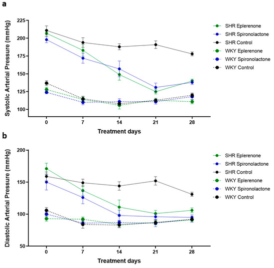 After 1 week of acclimatization, WKY and SHR rats were randomized into three groups (n = 12) comprising WHY (n = 6) and SHY (n = 6). The first group was treated with eplerenone (50 mg/kg/day, Inspra, Pfizer, New York, NY, USA) via oral administration, the second group was treated with spironolactone (100 mg/kg/day, Aldactone, Pfizer, New York, NY, USA) and the third group was untreated. as control. Rats received treatment for a 28-day period, during which systolic and diastolic blood pressures were monitored by using the tail-cuff method every seven days.