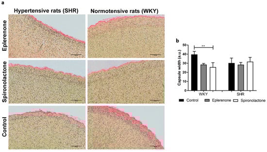 There was no significant difference in the width of the adrenal capsule between SHR and WHY rats (Figure 3). Nevertheless, normontensive WKY rats treated with spironolactone had a significantly narrower adrenal capsule (WKY control: 39.72 ± 3.33 vs. WKY spironolactone: 25.80 ± 4.86, p < 0.01).