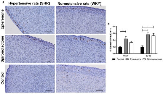 Proliferation in the cortices of SHR and WKY rats was not significantly different. However, Ki-67 expression was higher in SHR exposed to MRAs, an effect that was both observed after eplerenone (SHR control: 0.20 ± 0.03% vs. SHR eplerenone: 0.57 ± 0.12%; p < 0.01) and spironolactone treatment (SHR control: 0.20 ± 0.03% vs. SHR spironolactone: 0.54 ± 0.06%; p < 0.05). In WKY normotensive rats, a similar effect was observed only after eplerenone treatment, (WKY control: 0.19 ± 0.02% vs. WKY eplerenone: 0.44 ± 0.07; p < 0.05) (Figure 4).
