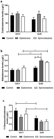 Corticosterone (a); aldosterone (b); and 11-deoxycorticosterone (c) plasma levels in Wistar Kyoto (WKY) and Spontaneous Hypertensive rats (SHR). * p < 0.05; ** p < 0.01.