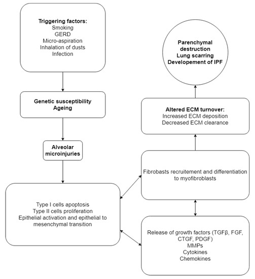 Disease pathogenesis is yet elusive; however, the current paradigm has shifted from an inflammation-mediated disease. Instead, aberrant wound healing as a response to unknown, repetitive, low immunogenicity-generating stimuli is considered as the triggering and preserving mechanism underlying the fibrotic process [12,13]. Smoking, gastric acid reflux and micro-aspiration as well as inhaled dusts and infectious agents, especially viruses, have been traditionally implicated as precipitating factors, suspected of triggering the initiation of fibrosis in genetically susceptible individuals (Figure 1) [14]. Despite their association with sporadic or familial IPF cases, none of these factors is considered to have a causative relation to the disease.