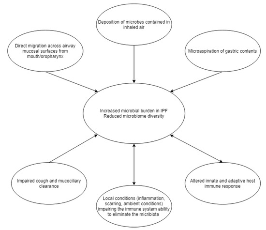 Summary of the mechanisms leading to increased microbial burden and reduced microbiota diversity in the idiopathic pulmonary fibrosis (IPF) lung. The relationship between the microbiome and local conditions as well as between the microbiome and the altered immunity is bidirectional, leading to a positive feedback loop.
