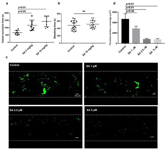 To check sanguinarine antithrombotic effect in vivo, we used the FeCl3 injury-induced carotid thrombosis model. A doppler flow meter detected the vessel occlusion time. While sanguinarine has great liver toxicity by intravenous and intraperitoneal injection, it is relatively safe for intragastric administration. The LD50 of sanguinarine is less than 200 mg/kg by intragastric administration [21]. Its TMAX is 2 h, and it completely eliminated from the plasma and liver after 24 h [11]. Sanguinarine (5 mg/kg or 10 mg/kg) was given intragastrically 24 h, 12 h and 2 h before modeling. The results indicated that the average occlusion times in 5 mg/kg and 10 mg/kg groups were 1166 s and 1427 s, respectively, which were much longer than that in the control group (660 s) (both p < 0.05) (Figure 2a). Nevertheless, the tail bleeding time was not prolonged in the sanguinarine treatment group (Figure 2b). This implies that the drug did not cause bleeding at the antithrombotic dose. Under normal and pathological conditions in vivo, the shear force exerted by blood laminar flow is considered an important environmental factor during platelet activation and thrombosis. [22]. To further demonstrate sanguinarine antithrombotic effect in clinic, a microfluidic system (Bioflux 1000Z, Fluxion Biosciences Inc., South San Francisco, CA, USA) was used to simulate the adhesion of human platelets to collagen matrix under high shear stress of arterial stenosis in vivo. We found that 1 μM, 2.5 μM and 5 μM sanguinarine significantly reduced the adhesion area of platelets to the collagen matrix under arterial shear (Figure 2c,d).