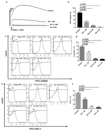 Sanguinarine decreases collagen-induced human platelet granule release and integrin αIIbβ3 activation. (a) Washed human platelets were prepared as shown in Figure 3. ATP secretion was documented and computed following the instructions in the Materials and Methods Section. (b) Data were shown as mean ± SEM (n = 5) and examined using one-way ANOVA analysis. (c–f) First, washed human platelets (5 × 107/mL) were preincubated for 10 min at 37 °C with sanguinarine (1, 2.5, 5 µM) or DMSO (control) in the presence of FITC-conjugated P-selectin and FITC-conjugated PAC-1 antibodies. Afterward, the platelets were stimulated with collagen (2 µg/mL) and incubated for another 5 min. P-selectin expression (c,d) and PAC-1 binding (e,f) were identified by flow cytometry. Results and data were expressed as mean ± SEM (n = 5).