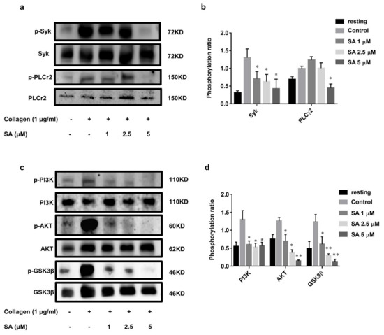 To further investigate the specific molecular mechanism of sanguinarine in inhibiting collagen-induced human platelet activation, we checked the phosphorylation of several proteins downstream of the GPVI signaling pathway, such as Syk-PLCγ2 and PI3K-Akt-GSK3β. The results (Figure 5a,b) showed that 1 μM, 2.5 μM and 5 μM of sanguinarine significantly inhibited Syk phosphorylation, while only 5 μM of sanguinarine appeared to inhibit PLCγ2 phosphorylation. The PI3K-Akt-GSK3β pathway plays a key role in activating platelets, and is an important component downstream of GPVI signaling [23,24]. As shown in Figure 5c,d, sanguinarine effectively inhibited the phosphorylation of PI3K, Akt and GSK3β in collagen-stimulated platelets. The results suggested that sanguinarine negatively regulated the phosphorylation of Syk-PLCγ2 and PI3K-Akt-GSK3β downstream of platelet GPVI.