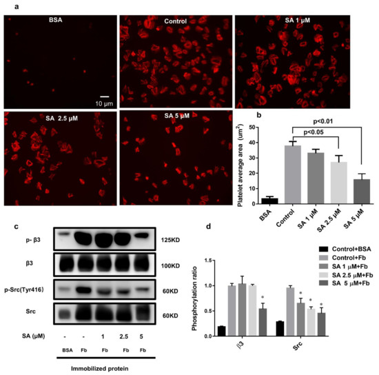 We also found that sanguinarine inhibited human platelet adhesion and spreading on the fibrinogen-coated matrix (Figure 7a,b). Compared with the control group, sanguinarine inhibited platelet spreading on immobilized fibrinogen. The platelet surface coverage was much smaller at 5 μM. We further analyzed the molecular mechanism of sanguinarine on platelet outside-in signal transduction by detecting the related protein’s phosphorylationin-spreading platelet. β3 phosphorylation is a direct indicator of αIIbβ3 activation, and Src activation is also associated with outside-in signal transduction [26]. The results demonstrated that phosphorylation of β3 and Src (Tyr 416) was reduced significantly in the presence of sanguinarine (Figure 7c,d). This suggests that sanguinarine plays a significant role in inhibiting the αIIbβ3 outside-in signal transduction.