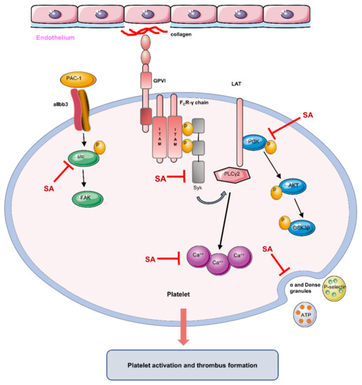Platelets are discoid, anucleate cells that are continuously produced by megakaryocytes. They are key factors during hemostasis and thrombosis, along with other physiological and pathological processes [1]. Epidemiological investigations indicate that several risk factors of thrombosis are related to high platelet activity and excessive activation of endothelial cell procoagulant functions. Moreover, abnormal platelet adhesion, aggregation, granule release and spreading can be the basis of thrombotic disease [2]. The subendothelial matrix proteins collagen and von Willebrand factor (vWF) are exposed by the damages to endothelium. Thrombus is initiated by adhesion of platelet to collagen (via GPVI) and vWF (via GPIb-V-IX) [1]. Syk-PLCγ2 and PI3K-Akt signaling pathways are involved in collagen-activated platelets. Then it results in mobilization of cytoplasmic calcium, platelet shape change and granule release [3,4,5]. Platelets release a few soluble agonists, including ADP and thromboxane A2. Thus, intensifying activated platelets attracts more platelets from circulation to enlarge the thrombus [6]. Arterial thrombosis from platelet activation leads to the acute severe symptoms of heart disease and thrombotic stroke [7]. Currently, the most effective and clinically recommended antiplatelet drugs are cyclooxygenase-1, platelet adenosine diphosphate (ADP) receptor P2Y12 and integrin αIIbβ3 inhibitors [8]. However, all the recommended treatments do have a few limitations, specifically in single-target treatments. These limitations lead to drug resistance and poor selectivity, which in turn increase the risk of irreversible bleeding [9]. In recent years, more researchers have focused on the antiplatelet and antithrombotic activities of natural compounds in Chinese herbal medicine [10].