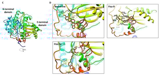 (A) FtsZ model obtained with I-TASSER Server; (B) predicted interactions between FtsZ and compounds 5b, 6–8; (C) FtsZ rotation of 180°; (D) predicted interactions with berberine and compounds 5a, 9. The interactions prediction was obtained using the Protein-Ligand Interaction Profiler (PLIP) Server. The residues involved in the interaction and the connection between the residues are in yellow. Images were generated by the CHIMERA software.
