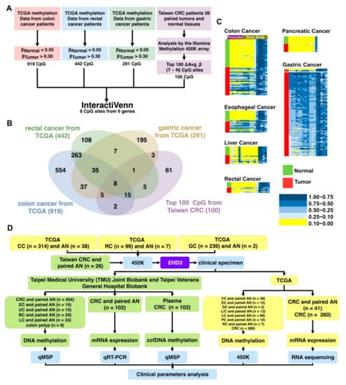 Gene selection and experimental design. (A) Stepwise gene selection flowchart. (B) Gene screening performed using http://www.interactivenn.net/ (accessed on 4 November 2020) [22]. (C) Methylation heatmap of EHD3 in paired colon cancer, liver cancer, pancreatic cancer, esophageal cancer, rectal cancer, and gastric cancer tissues. (D) The experimental design is shown in the flowchart, and sample types and sizes are indicated. BC, breast cancer; EC, esophageal cancer; LC, lung cancer; UC, uterine cancer; CC, colon cancer; RC, rectal cancer; LiC, livesr cancer; GC, gastric cancer; PC, pancreatic cancer; CRC, colorectal cancer; AN, adjacent normal; ccfDNA, circulating cell-free DNA; QMSP, quantitative methylation-specific PCR; qRT-PCR, quantitative reverse-transcription PCR; IHC, immunohistochemistry; 450K, Illumina Infinium HumanMethylation450 BeadChip array.