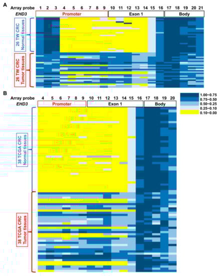 Different methylation at EHD3 CpG islands in patients with CRC. Methylation levels (average β values) at the differentially methylated loci were identified using an Illumina Methylation 450K array-based assay in (A) 26 patients with CRC in Taiwan and (B) 38 patients with CRC from the TCGA dataset. The scale shows the relative methylation status from 0.00 to 1.00 (yellow: hypomethylation, blue: hypermethylation). Twenty-one CpG sites on EHD3 were detected in 26 paired normal (upper) and CRC (lower) tissues, and array probes 1–21 were sites cg13149833, cg12045528, cg00648955, cg25202298, cg06773122, cg00981472, cg18444347, cg05882522, cg27230038, cg25428398, cg15355118, cg25840208, cg24743639, cg13795465, cg01163837, cg08251399, cg11957382, cg07185119, cg20203365, cg14018959, and cg14613979, respectively.