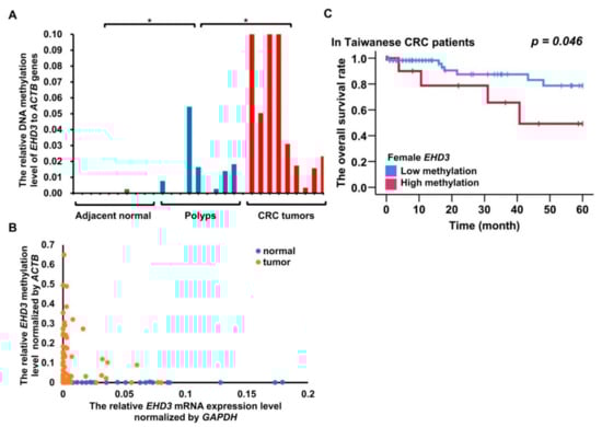 DNA methylation and mRNA expression analysis of EHD3 from an Asian cohort. * p < 0.05. (A) EHD3 methylation level in nine adjacent normal colon tissues, nine polyps of tubular adenoma, and nine CRC tumors. The Mann–Whitney U test was used to compare adjacent normal colon tissues and tubular adenoma and to compare tubular adenomas and CRC tumors. (B) Spearman’s rank-order correlation was used to estimate the correlation between EHD3 promoter methylation and mRNA expression in the matched normal and tumor tissues. (C) The Kaplan–Meier estimate was used to compute the overall survival of women with and without EHD3 hypermethylation. An EHD3 promoter methylation level in CRC tumors 200-fold higher (90th percentile) than that in adjacent normal colorectal tissues was defined as hypermethylation.
