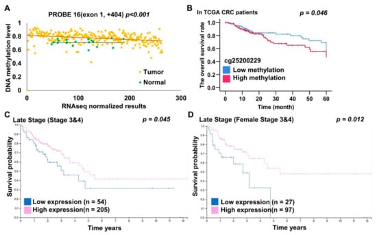 Analysis of RNA and protein data indicated that EHD3 RNA and protein expression was significantly reduced in CRC tumor tissues compared with matched normal tissues (p = 0.029 and p < 0.001) [23]. The Pearson correlation test revealed that for probes 1–15 in promotor and exon 1, EHD3 mRNA expression and EHD3 hypermethylation were significantly, and at least modestly, negatively correlated. Moreover, the test indicated a moderately negative correlation in probe 16, which was in exon 1 (Pearson correlation = −0.416, p < 0.001, Figure 4A, n = 289 tumors). By contrast, the correlation was positive in the EHD3 gene body region and three-prime untranslated region (array probes 18–21, p < 0.05). Prognoses were poorer in patients exhibiting hypermethylation than in those exhibiting low methylation of EHD3 promoter probe 4 (Figure 4B, p = 0.046). Multivariate Cox proportional-hazards survival analysis indicated that EHD3 hypermethylation was independently and significantly associated with overall survival after adjustment for age, location, tumor size, lymph invasion, and metastasis (Table S2, p = 0.039). Patients with late-stage cancer and female patients with late-stage and low EHD3 protein expression consistently had poorer prognoses than did those with high EHD3 protein expression (Figure 4C,D, p = 0.045 and p = 0.012) [24].