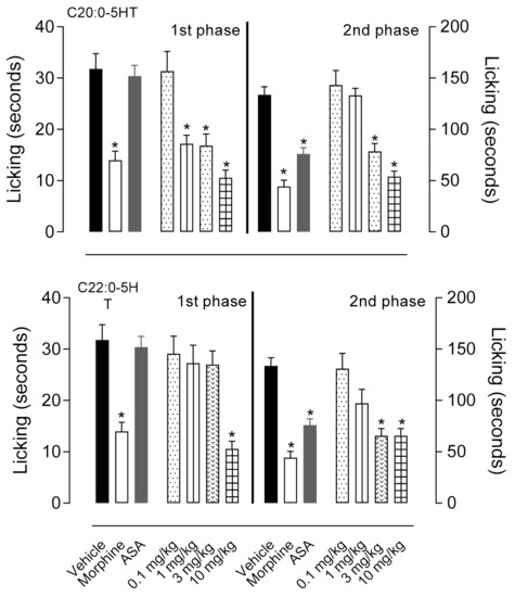 Effects of βN-arachinoyl-5-hydroxytryptamide (C20:0-5HT) and βN-behenoyl-5-hydroxytryptamide (C22:0-5HT) on formalin-induced licking behavior in mice. Animals were pretreated orally with C20:0-5HT or C22:0-5HT, morphine (5 mg/kg), acetylsalicylic acid (ASA, 200 mg/kg), or vehicle, and the time of licking the formalin-injected paw was recorded (in seconds) at the first phase (0–15 min post-formalin injection) and second phase (15–30 min post-formalin injection). The results are presented as mean ± SD (n = 7 animals per group). The average in the morphine groups was significantly decreased as compared with the respective vehicle group to each phase (first or second phase). All three doses of C20:0-5HT significantly reduced the licking time in the 1st phase and the two higher doses of the same compound reduced it in the 2nd phase. The dose of 10 mg/kg of C22:0-5HT significantly reduced the licking time in the 1st phase and the two higher doses of the compound reduced it in the 2nd phase. ASA was decreased as compared with the vehicle group in the 2nd phase only. Statistical significance was calculated by one-way ANOVA followed by Tukey’s test. * p < 0.05 as compared with vehicle-treated mice.