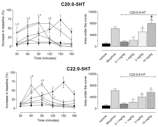 Antinociceptive effects of βN-arachinoyl-5-hydroxytryptamide (C20:0-5HT) and βN-behenoyl-5-hydroxytryptamide (C22:0-5HT) evaluated in the hot plate model. Animals were orally pretreated with different doses of C20:0-5HT or C22:0-5HT, morphine (5 mg/kg), or vehicle. Left graphs (line graphs) represent the time of response to the hot plate (shown as a percentage increase in relation to the baseline) evaluated between 30 and 180 min after oral administration. The right graphs represent the area under the curve calculated based on data obtained from line graphs. The results are presented as mean ± SD (n = 8 per group) of the increase in baseline (left graphs) or area under the curve (right graphs) calculated by two-way ANOVA followed by Tukey’s post hoc test. Morphine and higher doses (3 and 10 mg/kg) of C20:0-5HT and C22:0-5HT showed a significant increase in AUC as compared with the vehicle-treated group. C20:0-5HT (at 30 mg/kg) demonstrated a significant effect as compared with the morphine-treated group. * p < 0.05 as compared with the vehicle-treated group and # p < 0.05 as compared with the morphine-treated group.