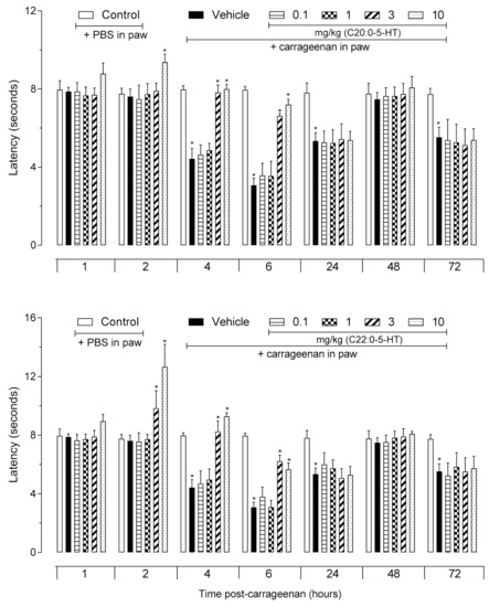 This method was performed, as described by Sammons et al. [25]. Two measures (with 30 min intervals) prior to carrageenan injection were done and the average result was referred to as “baseline”. Animals (n = 8 per group) received an intraplantar injection of carrageenan (25 µL/paw, 2%) and after 1 h were placed in a hot plate (Insight Equipment, São Paulo, Brazil) set at 55 ± 1 °C. The reaction to the hot plate was recorded as mentioned previously. Vehicle, C20:0-5HT, or C22:0-5HT was orally administered to mice 30 min before the injection of carrageenan. Reductions in the reaction time on the hot plate were taken as indicative of the development of inflammatory hyperalgesia.