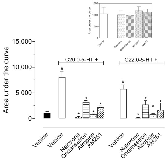 Effects of different antagonists on the antinociceptive activity of βN-arachinoyl-5-hydroxytryptamide (C20:0-5HT) and βN-behenoyl-5-hydroxytryptamide (C22:0-5HT) evaluated in the hot plate model. Naloxone (1 mg/kg, i.p.), ondansetron (0.5 mg/kg, i.p.), atropine (1 mg/kg, i.p.), or AM251 (1 mg/kg, i.p.), were administered 30 min prior to oral administration of C20:0-5HT or C22:0-5HT (10 mg/kg). All antagonists completely (naloxone and atropine) or partially (ondansetron and AM251) reverted the antinociceptive effect of C20:0-5HT and C22:0-5HT. Data are expressed as mean ± SD (n = 8). One-way ANOVA followed by Tukey’s post hoc test was used to calculate the statistical significance. # p < 0.05, when comparing C20:0-5HT- or C22:0-5HT-treated mice to the vehicle-treated group and * p < 0.05, when comparing antagonists pretreated mice with C20:0-5HT or C22:0-5HT-treated groups.