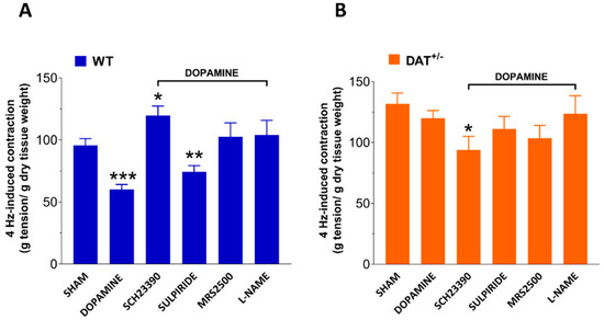 DAT hypofunction affects dopaminergic neuromuscular response. Neuromuscular excitatory response induced by 4 Hz-EFS in absence or presence of 10 µM dopamine after pretreatment with SCH23390, sulpiride, MRS2500 or L-NAME in isolated ileal preparations of WT (A) and DAT+/− (B) mice. Data are reported as mean ± SEM. * p < 0.05, ** p < 0.01, *** p < 0.001 vs. respective control mice. n = 5 mice/group.