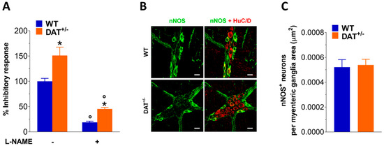 DAT influences NO-mediated relaxation. (A) 10 Hz EFS-evoked relaxation in NANC conditions with or without or 100 μM L-NAME (pan-NOS inhibitor) in ileal segments of WT and DAT+/− mice. (B) Representative confocal microphotographs showing the distribution of HuC/D (red) and nNOS (green) and (C) analysis of nNOS+ neurons in ileal LMMPs of WT and DAT+/− mice (bars = 22 μm). Data are reported as mean ± SEM. * p < 0.05 vs. WT; ° p < 0.05 vs. respective control in NANC condition. n = 5 mice/group.
