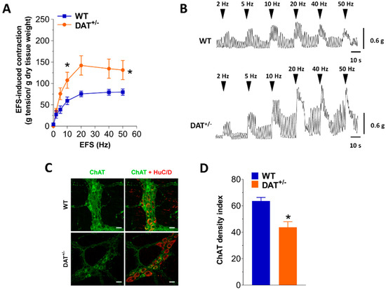 Small intestinal smooth muscle response to the depolarizing agent KCl (60 mM) was not affected by DAT hypofunction (Supplementary Figure S1B). To confirm that ileal contraction changes in DAT+/− mice were caused by alterations in neuromuscular function, we assessed the effect of EFS at increasing frequencies on ileal preparations. In DAT+/− mice, EFS-elicited contractions triggered a significantly increase of the response by about +78% at 10 Hz and +65% at 50 Hz compared to WT mice (Figure 4A,B), suggesting the presence of an altered excitatory neurotransmission. We have previously shown that in mouse ileum, EFS-mediated contractions to frequencies up to 10 Hz are of neuronal cholinergic origin, being sensitive to both tetrodotoxin and atropine [20,25]. Intriguingly, ChAT immunoreactivity was found significantly reduced in ileal whole mount preparations of DAT+/− mice compared to WT mice (−31%, p < 0.05; Figure 4C,D). The higher EFS-mediated contractions together with no changes in CCh- or KCl-mediated contractions and reduced ChAT immunoreactivity in DAT+/− mice might advocate for a contributing role of other excitatory pathways such as the tachykininergic or glutamatergic neurotransmission.